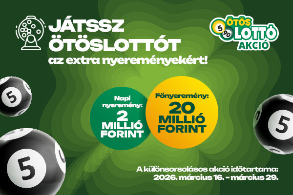 Játssz március 16. és 29. között Ötöslottót egy szelvényen legalább 1600 Ft értékben, és nyerj naponta 2 millió forintot, vagy vidd el akár a 20 millió forintos főnyereményt!
