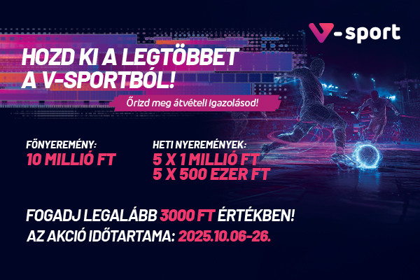 Fogadj V-sportra egy szelvényen, legalább 3000 Ft értékben, és őrizd meg az átvételi igazolásod, hogy a tiéd lehessen akár a 10 millió Ft főnyeremény, vagy a további értékes heti pénznyeremények egyike!