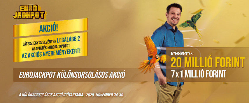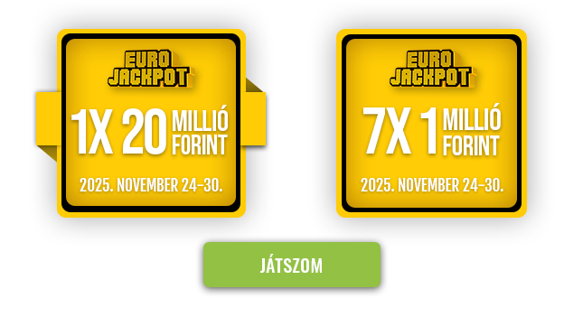 Játssz 2025. november 24-30. között egy szelvényen legalább 2 alapjáték Eurojackpotot, hogy megnyerhesd a 7 x 1 millió Ft pénznyeremény egyikét, vagy akár a 20 millió Ft-ot is!