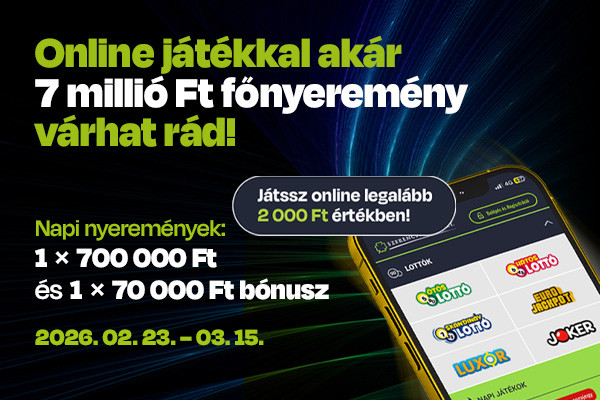 Játssz online a szerencsejatek.hu oldalon bármely játékkal összesen legalább 2000 Ft értékben, és már indulsz is a napi nyereményekért, valamint automatikusan résztvevője leszel a 7 millió forintos főnyeremény sorsolásnak is!