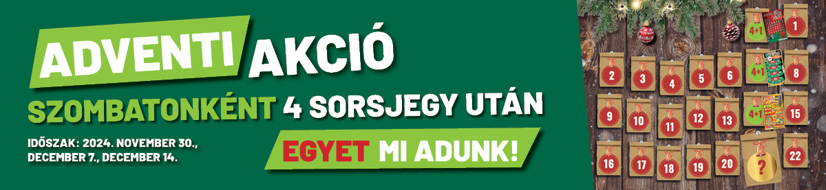 - 2024. december 7-én min. 4 db Szuper Black Jack sorsjegyet, így vásárlásonként 1 db extra Szuper Black Jack sorsjegyre jogosult.