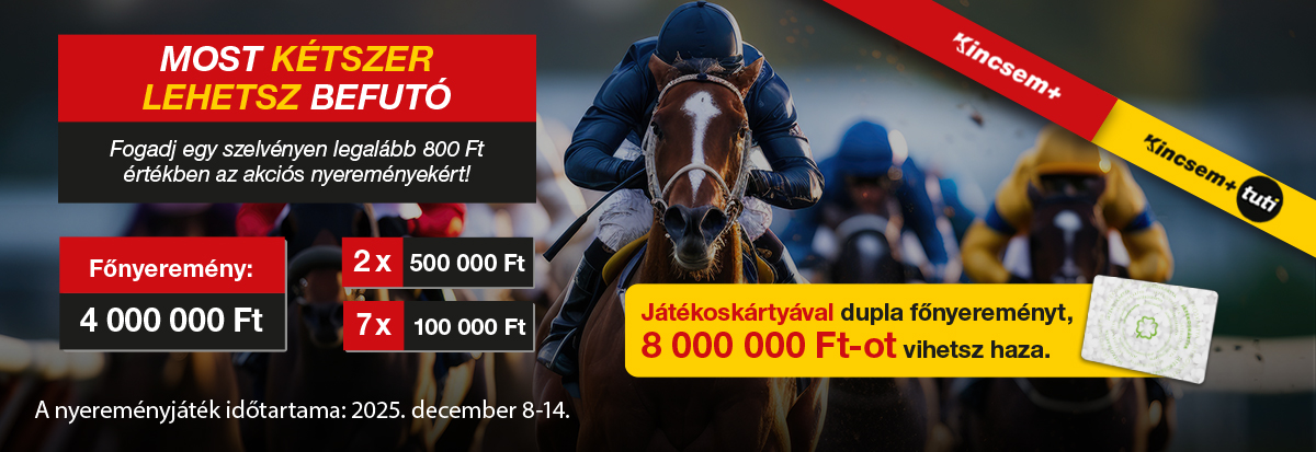 Vásárolj 2025. december 8-14. között egy szelvényen legalább 800 Ft értékben Kincsem+ vagy Kincsem+ TUTI fogadást, és máris automatikusan részt veszel az akció nyereményeinek sorsolásán!