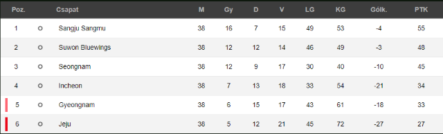 A dél-koreai bajnokság felsőházának 2019-es végeredménye. Pontegyenlőségnél a több szerzett gól döntött.