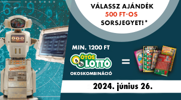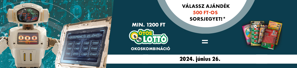 Játssz június 26-án egy szelvényen legalább 1200 Ft értékű Okoskombinációval feladott Ötöslottót, és egy választható 500 Ft értékű sorsjegyet (Kis Kerék, Kis Meglepetés, Nyomkövető, Szuper Black Jack, Szuper Bankó, Puskás 500) ajándékba adunk!