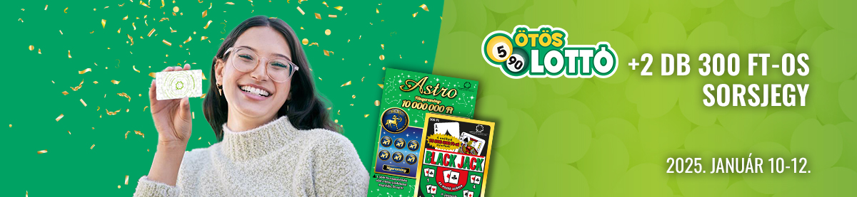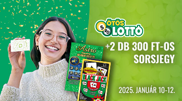Játssz Játékoskártyáddal 2024. január 10. 7:00 és január 12. 17:30 között egy szelvényen legalább 2400 Ft értékben Ötöslottót, és 2 választható, 300 Ft értékű sorsjegyet (Astro, Black Jack, Fáraók Kincse) kapsz!