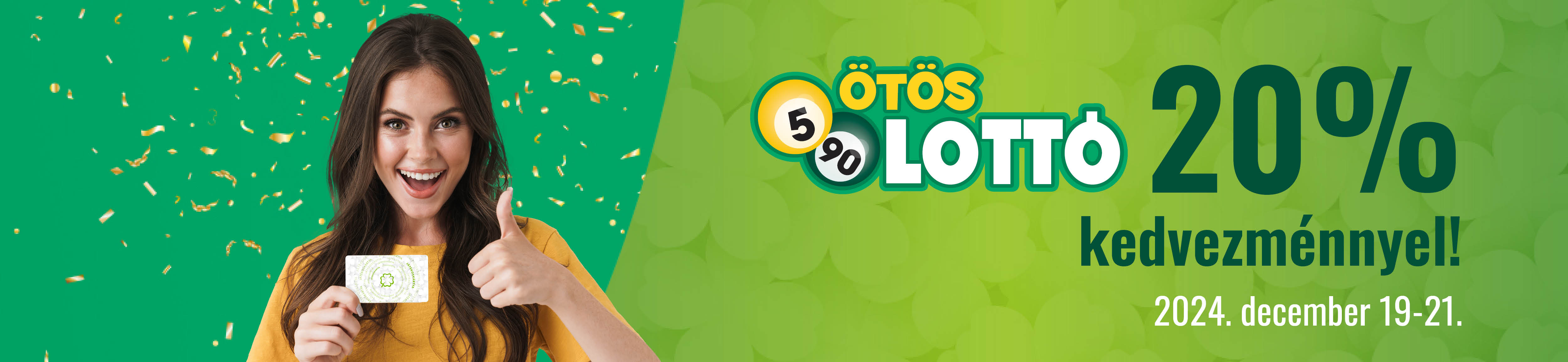 A játékosnak játékba kell küldenie egy átvételi igazoláson legalább 1600 Ft értékben Ötöslottót a Játékoskártyájának használatával. Ezt követően a játékosnak 20%, de maximum 5000 Ft árkedvezményt adunk, amely az ajánlatot teljesítő átvételi igazoláson lévő Ötöslottó alapjátékok árából kerül levonásra.