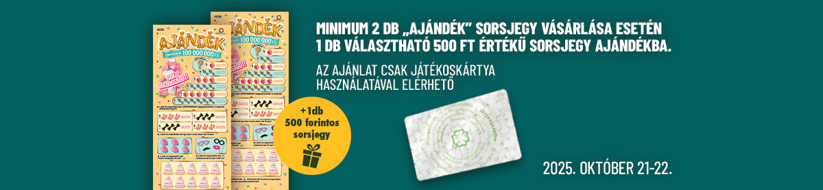 A játékosnak a kijelölt értékesítőhelyek egyikében vásárolnia kell az akció időszakában minimum 2 db „Ajándék”! sorsjegyet. Az ajánlat feltételeinek teljesülése esetén a játékos vásárlásonként 1 db, választható 500 Ft-os sorsjegyet kap. A választható sorsjegyek az értkesítőhelyek készletének függvényében: Puskás 500, Szuper Bankó, Szuper Black Jack, Kis Kerék, Fáraók Kincse.Az ajánlat feltételei kizárólag a Szerencsejáték Zrt. földi értékesítői hálózatában, a terminállal rendelkező értékesítőhelyeken teljesíthetőek (kivéve a Magyar Posta Zrt. postáin, postapartnereinél), az online fogadási felületeken nem érvényes.