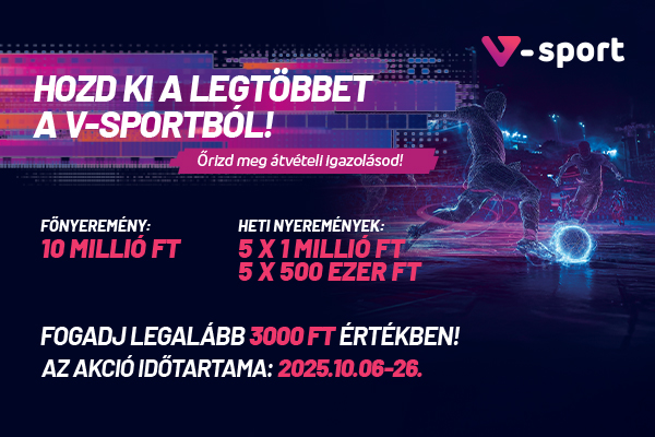 Fogadj V-sportra egy szelvényen, legalább 3000 Ft értékben, és őrizd meg az átvételi igazolásod, hogy a tiéd lehessen akár a 10 millió Ft főnyeremény, vagy a további értékes heti pénznyeremények egyike!