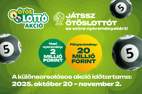 Játssz 10.20-11.02. között Ötöslottót egy szelvényen legalább 1600 Ft értékben, és nyerj naponta 2 millió forintot vagy akár a 20 millió forintos főnyereményt!