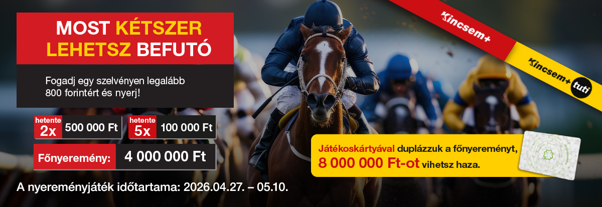 Vásárolj 2026. április 27.- május 10. között egy szelvényen legalább 800 forint értékben Kincsem+ vagy Kincsem+ TUTI fogadást, és máris automatikusan részt veszel a heti nyeremények sorsolásán, valamint a főnyeremény sorsolásán is!