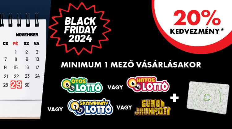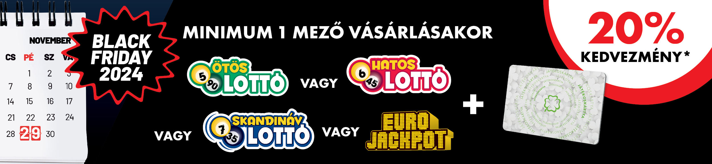A játékosnak játékba kell küldenie 2024. november 29-én vásárlásonként egy szelvényen legalább minimum 400 Ft értékű Ötöslottót/ Hatoslottót/ Skandináv lottót vagy 1 alapjáték Eurojackpotot, az aktív státuszú Játékoskártyájának használatával. Az ajánlat feltételeinek teljesülése esetén 20% kedvezmény kap (max. 5000 Ft értékben).