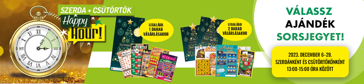 Vagy a játékosnak a kijelölt értékesítőhelyek egyikében vásárolnia kell szerdánként vagy csütörtökönként 13:00 és 15:00 között minimum 1 db Nagykarácsony 2023 sorsjegyet. Mindkét napon, az ajánlat feltételeinek teljesülése esetén a játékos vásárlásonként választhat a következő 500 Ft értékű sorsjegyek közül, az értékesítőhely készletének függvényében: Kis Meglepetés, NEON 500, Nyomkövető, Szuper Black Jack, Szuper Bankó