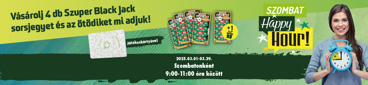 Az aktív státuszú Játékoskártyával rendelkező játékos az ajánlat érvényessége alatt szombatonként 09:00 és 11:00 között Szuper Black Jack vásárlása alapján lehet jogosult, a megadott napokon a megadott időszakban 1 db extra Szuper Black Jack sorsjegyre, a sorsjegykészlet erejéig.