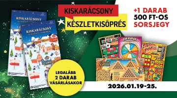 Vásárolj 2026. január 19. 7:00 és január 25. 23:45 között, egy tranzakcióban legalább 2 db Kiskarácsony sorsjegyet, és 1 db ráadás 500 Ft értékű sorsjegyet választhatsz (Puskás 500, Kis Kerék, Szuper Black Jack, Szuper Bankó, Fáraók Kincse)!