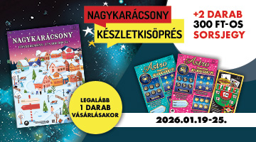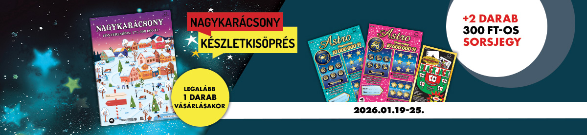 Vásárolj 2026. január 19. 7:00 és január 25. 23:45 között legalább 1 db Nagykarácsony sorsjegyet, és 2 db ráadás 300 Ft értékű sorsjegyet választhatsz (Astro, Black Jack)!