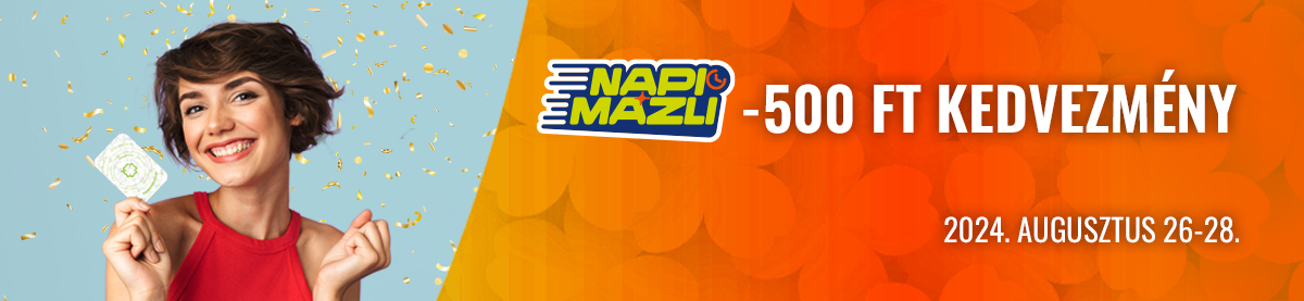 Vásárolj Játékoskártyáddal 2024. augusztus 26. 5:00 és augusztus 28. 23:00 között egy szelvényen legalább 1600 Ft egy vagy több sorsolásra érvényes Napi Mázlit és szelvényedből 500 Ft árkedvezményt adunk.