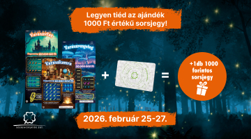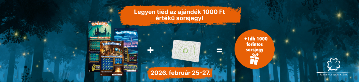 2026. február 25. 7:00 és február 27. 23:45 között legalább 1 Varázsvilág sorsjegycsaládot (1 db Varázskamra, 1 db Varázsrengeteg és 1 db Varázsvilág) egy tranzakcióban, és 1 db ráadás 1000 Ft értékű sorsjegyet kapsz.