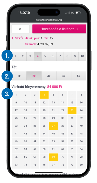 Válassz ki annyi számot 1-80 között, amennyit a Játéktípusnál beállítottál!
