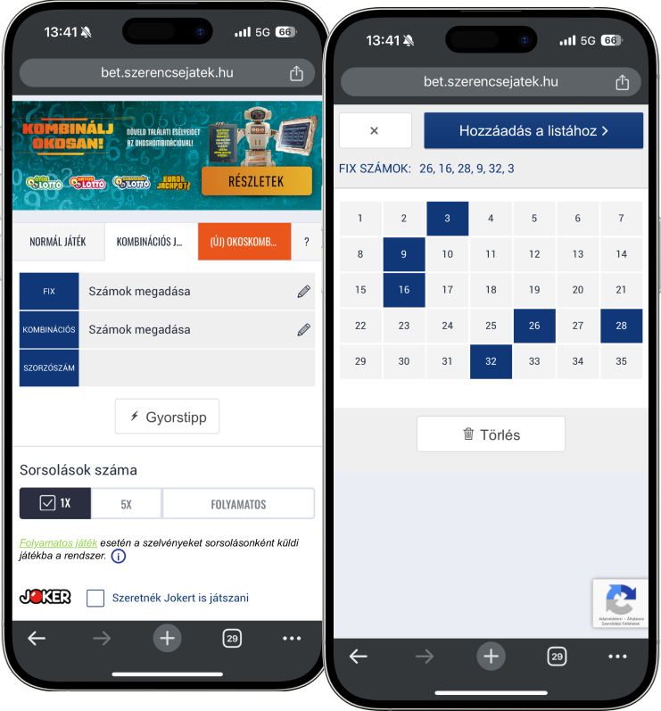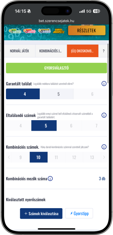 A kombinációs játékhoz hasonlóan az okoskombinációs játékban is több számot adhatsz meg, mint amennyi egy alapjátékban megjátszható, de itt csak kombinációs számokat jelölhetsz.