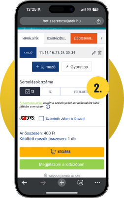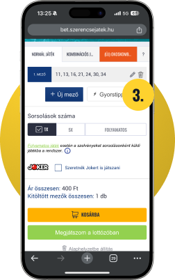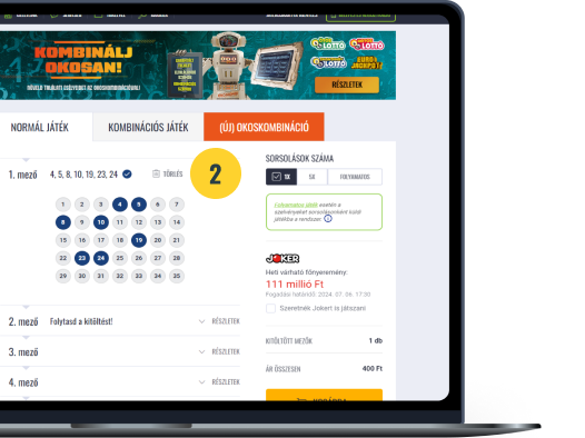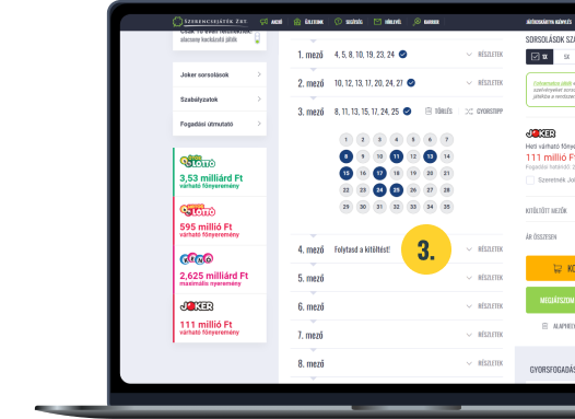 Például, ha két számmezőt szeretne kitölteni és a számokat 5 héten keresztül küldené játékba, akkor az ár: 400 Ft x 2 x 5 = 4 000 Ft.)
