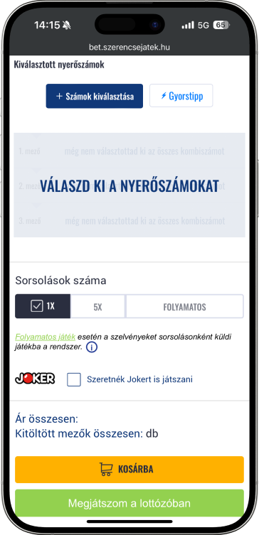Játszható saját számokkal és gépi formában, véletlen számokkal. Szelvényedet feladhatod 1 vagy 5 hétre is. Egyhetes játéktípus esetén csak a soron következő sorsolási eseményre, öthetes játék esetén a következő 5 sorsolási eseményre lesz érvényes a játékod.