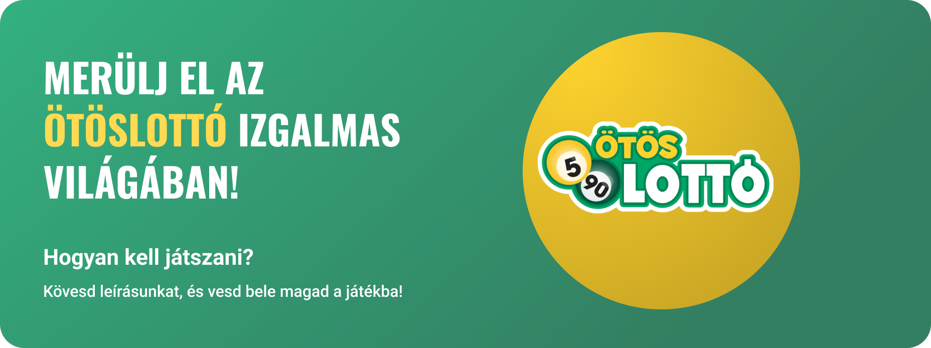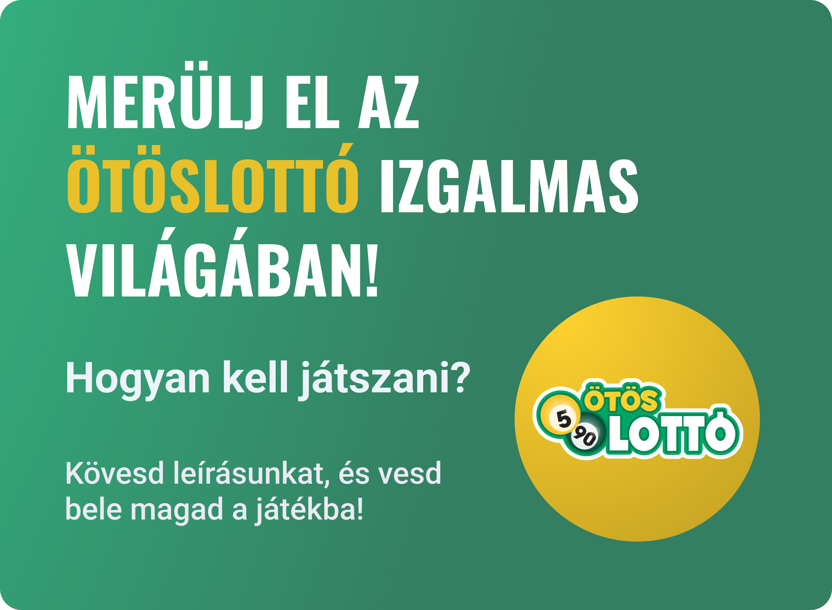 Az Ötöslottó játékban 90 számból kell 5-öt kiválasztani. A cél az, hogy minél többet eltalálj a hetente sorsolt 5 nyerőszám közül. Ez akkor jár pénznyereménnyel, ha legalább 2 találatod van egy mezőn, a főnyereményt az 5 találat jelenti.