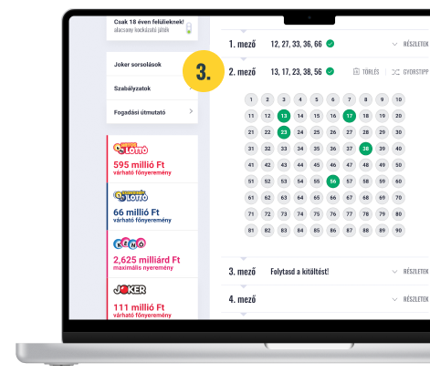 Például, ha két számmezőt szeretnél kitölteni és a számokat 5 héten keresztül küldenéd játékba, akkor az ár: 400 Ft x 2 x 5 = 4 000 Ft.