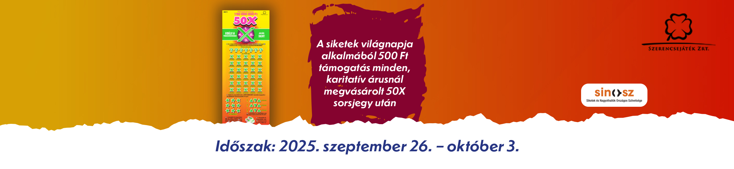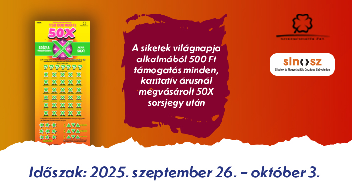Idén szeptember 26-ától, egy héten keresztül, október 3-ig - a Hallássérültek Világnapjához igazodva - sorsjegy akciót indítunk a karitatív hálózatunk bevonásával. A kezdeményezésünk célja: a siketek és nagyothallók emberek megsegítése. Az akció keretében ugyanis, minden - karitatív hálózat munkatársainál – legalább 1 db 50x-es Többszöröző sorsjegy után 500 forintot felajánlunk a Siketek és Nagyothallók Országos Szövetségének.