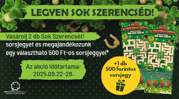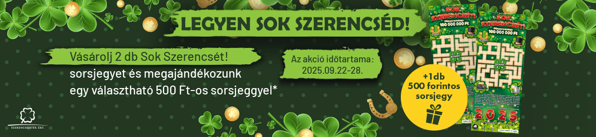 Vásárolj legalább 2 db Sok Szerencsét! sorsjegyet egy tranzakción belül, 2025. szeptember 22. 7:00 és szeptember 28. 23:45 között,és választhatsz 1 db 500 Ft értékű sorsjegyet (Puskás 500, Kis Kerék, Szuper Black Jack, Szuper Bankó, Fáraók Kincse)!